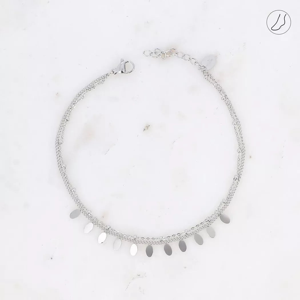 Bracelet de cheville 2 rangs sur chaîne en acier inoxydable composé d'une chaîne avec des boules en acier et d'une chaîne ornée de pampilles ovales plates.